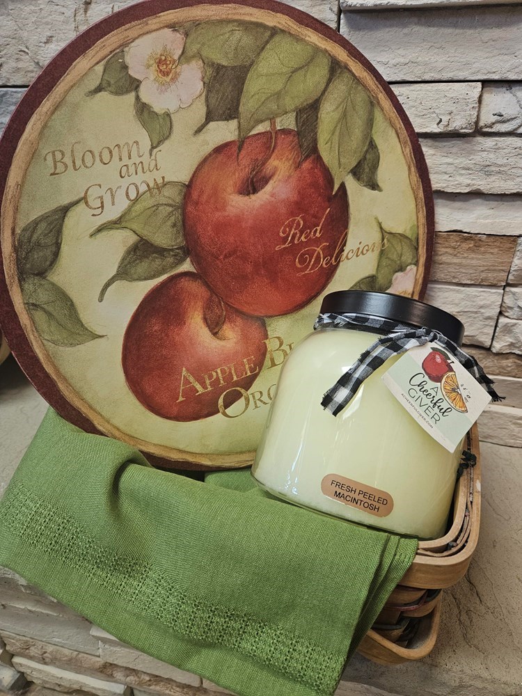 Bloom and Grow Table Trivet Fresh Peeled Macintosh Cheerful Giver Candle 34oz Oblong Fern Green Linen Tablecloth with intricate detail